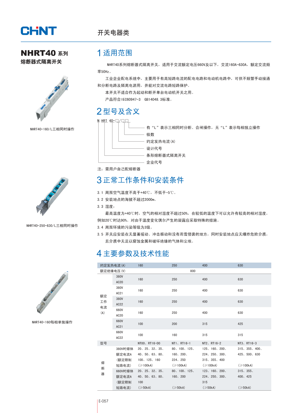 适用于交流额定电压 660V及以下,交流160A~630A,额定交流频率50Hz。工业企业配电系统中,主要用于有高短路电流的配电电路和电动机电路中,可供不频繁手动接通和分断电路及隔离电源用,并能对交流电路短路保护。本开关不适合作为起动和断开单台电动机开关之用。产品符合IEC60947-3 GB14048.3标准 | |